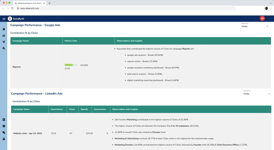 “Currently DataMyth supports Facebook Ads, Google Ads, Google Search Console, or Google Analytics, I have easily connected all these platforms. It produced nice performance analysis reports based on the metric I have selected, it saves me a lot of time. You can produce varied kinds of reports based on your needs, which are very detailed and easy to understand. Team is also working hard to put more integrations in place.“